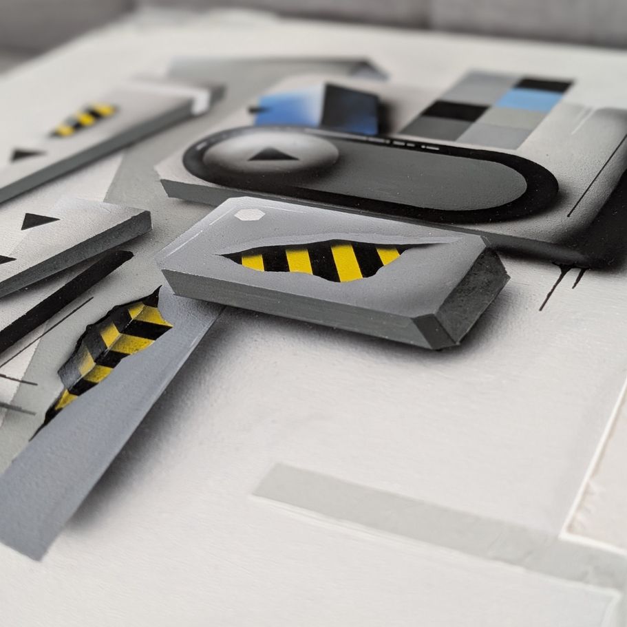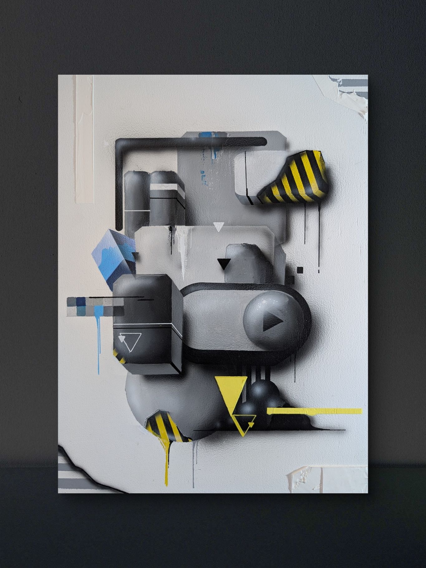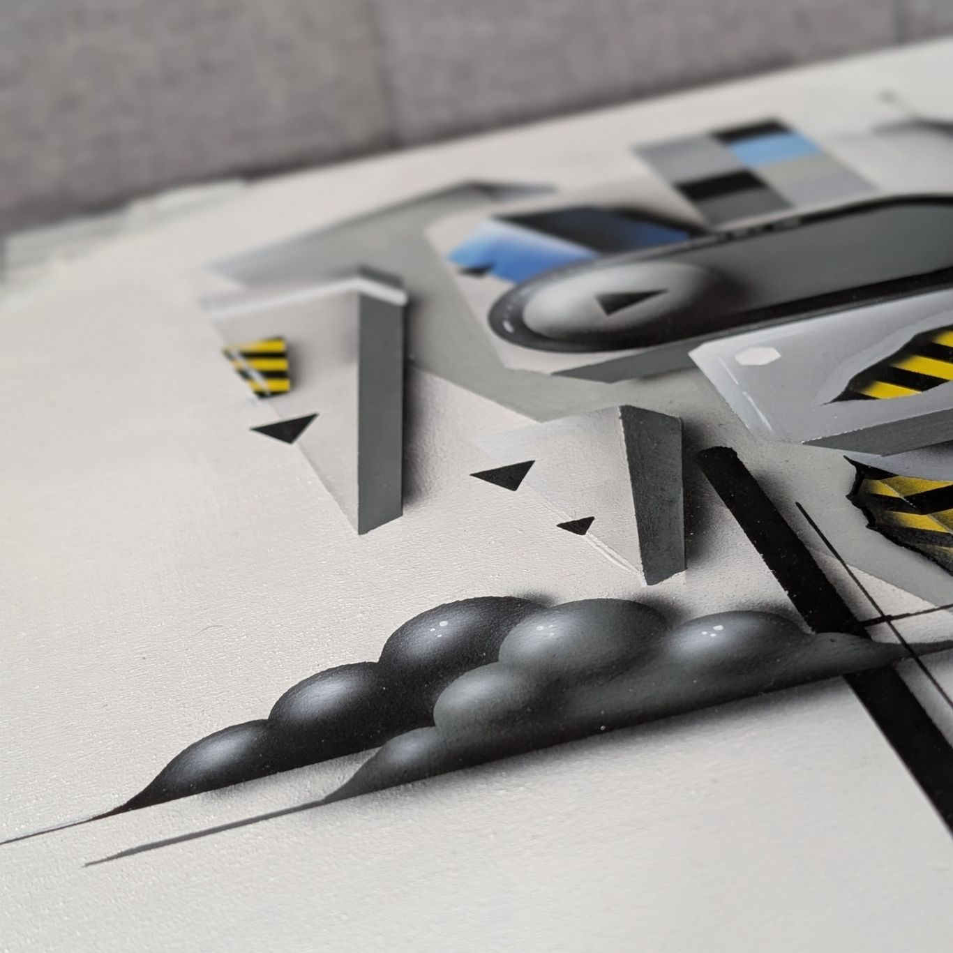 Das Bild zeigt eine moderne, abstrakte Komposition aus geometrischen 3D-Elementen in Grau- und Blautönen, die durch markante gelb-schwarze Warnstreifen und weiche Schatten eine industrielle, fast haptische Wirkung auf einem weißen Untergrund erzielt.