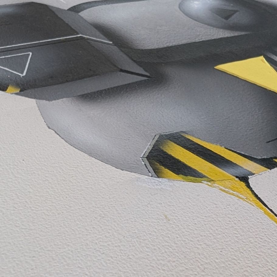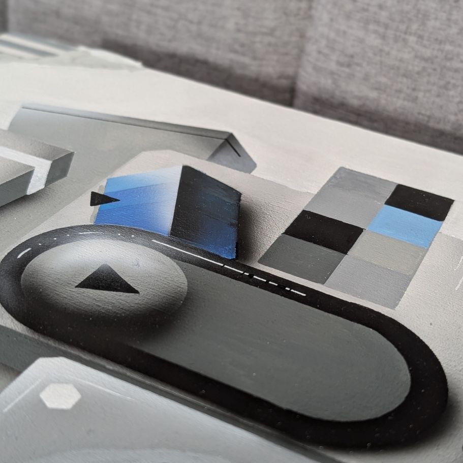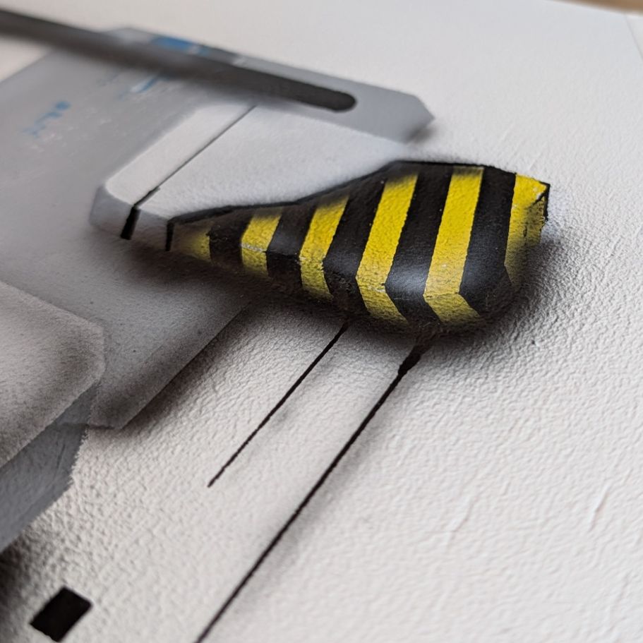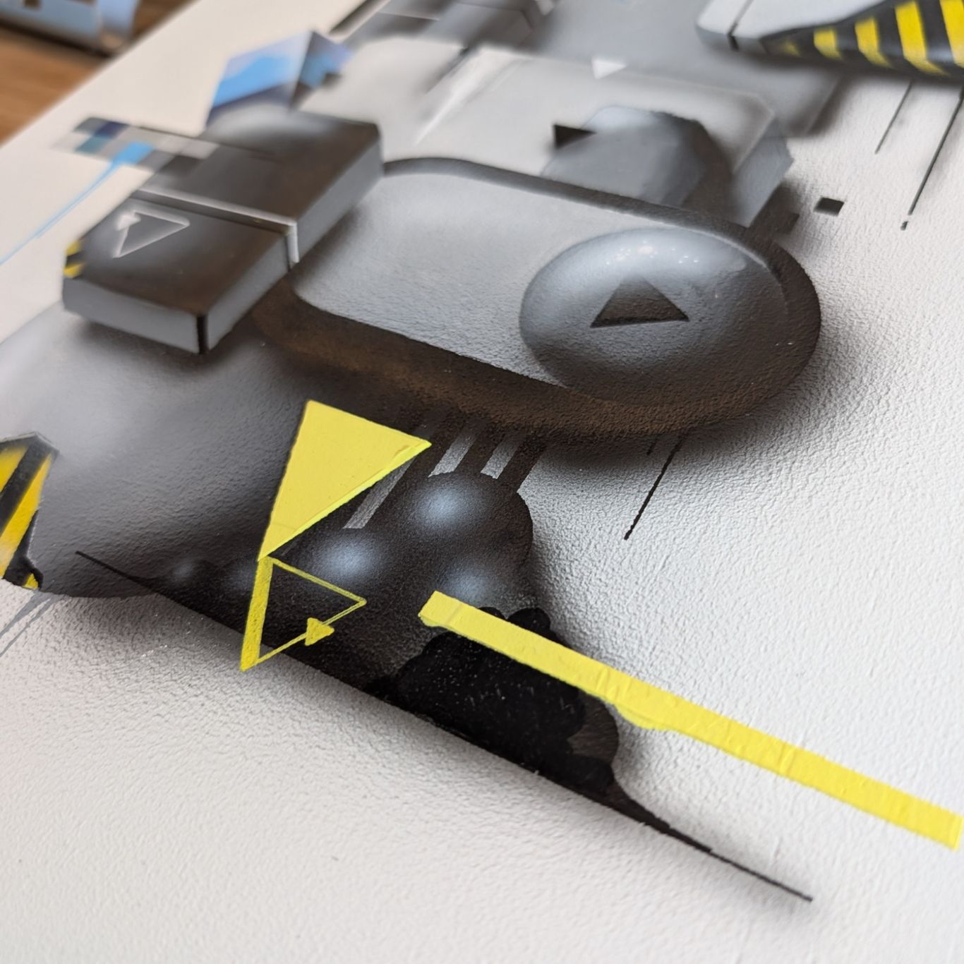 Das Bild zeigt eine moderne, abstrakte Komposition aus geometrischen 3D-Elementen in Grau- und Blautönen, die durch markante gelb-schwarze Warnstreifen und weiche Schatten eine industrielle, fast haptische Wirkung auf einem weißen Untergrund erzielt.