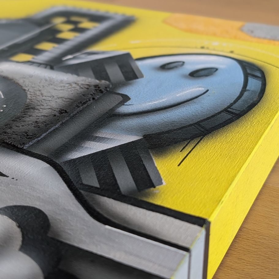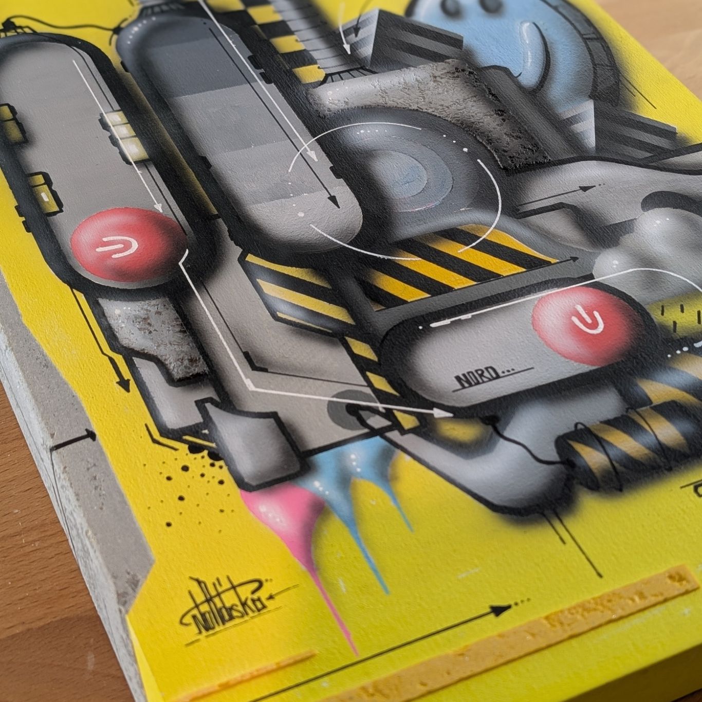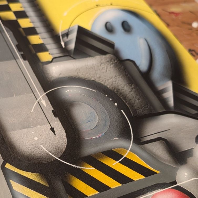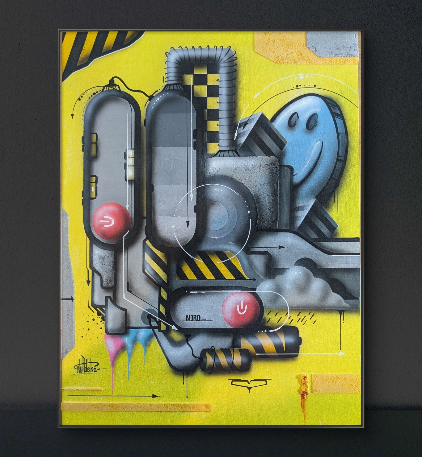 Das Werk präsentiert eine faszinierende industrielle Fantasiewelt, die durch geometrische Formen und leuchtende Farben belebt wird. Zentrale Elemente, wie zylinderförmige Objekte mit roten Knöpfen und schwarz-gelbe Streifen, suggerieren Technologie und Funktionalität. Im Hintergrund verleiht ein schelmisch lächelndes Gesicht der Szene einen Hauch von Humor.
