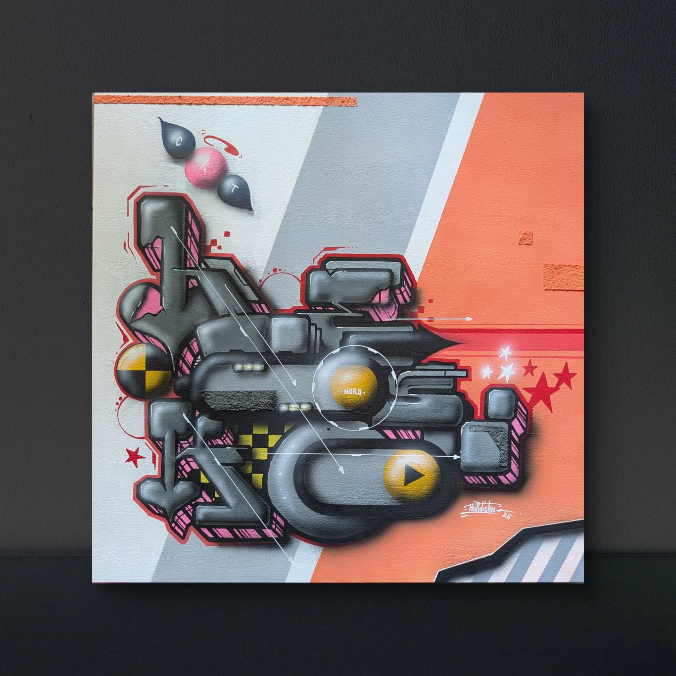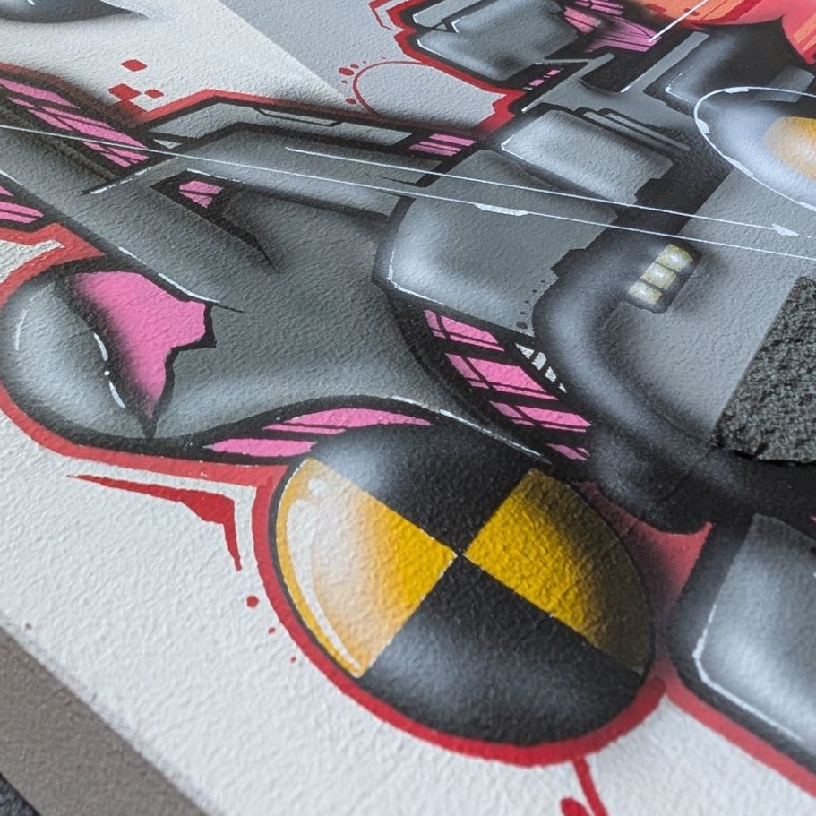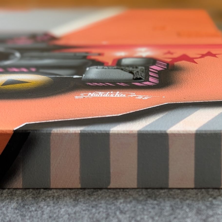 Das Werk besticht durch seine moderne und dynamische Gestaltung, in der der Schriftzug „HESK“ prominent hervorgehoben wird. Die leuchtenden Farben Blau, Gelb und Rosa schaffen einen lebhaften Kontrast. Umgeben von dekorativen Elementen wie Sternen, Wolken und geometrischen Formen wirkt es verspielt und dennoch strukturiert.
